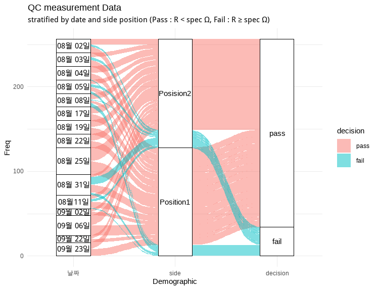 df %>% pivot_longer(cols = `1번`: `8번`, names_to = "position", values_to = "resistance") %>% mutate(side = ifelse(position %in% c("1번", "2번", "3번", "4번"), "Position1", "Posision2")) %>% mutate(decision = ifelse(resistance < spec, "pass", "fail")) %>% mutate(decision = factor(decision, levels=c("pass", "fail"))) %>% group_by(세정.일, side, decision) %>% summarise(Freq = sum(ifelse(decision == "pass", 1, -1)), .groups = "drop") %>% mutate(Freq = abs(Freq)) %>% ggplot(aes(axis1 = 세정.일, axis2 = side, axis3 = decision, y = Freq)) + scale_x_discrete(limits = c("날짜", "side", "decision"), expand = c(.2, .05)) + xlab("Demographic") + geom_alluvium(aes(fill = decision)) + geom_stratum() + geom_text(stat = "stratum", aes(label = after_stat(stratum))) + theme_minimal() + ggtitle("QC measurement Data", "stratified by date and side position (Pass : R < spec Ω, Fail : R ≥ spec Ω)")
