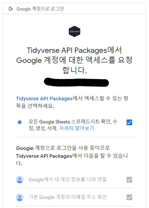 df <- googledrive::drive_get("GPT를 이용한 구글 스프레드시트") %>% read_sheet() gs4_auth()3. 그러면 아래와 같은 계정 확인 및 권한 허용 화면이 나옴