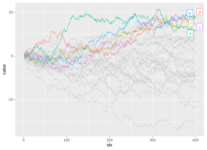 ggplot(d) + geom_line(aes(idx, value, colour = type)) + gghighlight(max(value) > 17) ggplot(d) + geom_line(aes(idx, value, colour = type)) + gghighlight(max(value) > 17) + theme_minimal() ggplot(d) + geom_line(aes(idx, value, colour = type)) + gghighlight(max(value) > 17) + theme_minimal() + facet_wrap(~ type)