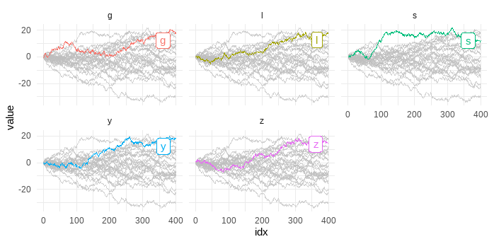 set.seed(2) d <- purrr::map_dfr( letters, ~ data.frame( idx = 1:400, value = cumsum(runif(400, -1, 1)), type = ., flag = sample(c(TRUE, FALSE), size = 400, replace = TRUE), stringsAsFactors = FALSE ) ) head(d)3. 그래프 그리기