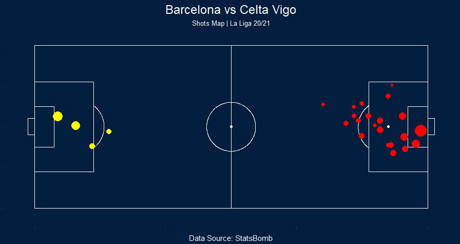 barcelona_shot <- clean_df %>% filter(type.name == 'Shot') %>% filter(team.name == 'Barcelona') %>% select(player.name, location.x, location.y, shot.end_location.x, shot.end_location.y, shot.statsbomb_xg) celta_shot <- clean_df %>% filter(type.name == 'Shot') %>% filter(team.name == 'Celta Vigo') %>% select(player.name, location.x, location.y, shot.end_location.x, shot.end_location.y, shot.statsbomb_xg) ggplot() + annotate_pitch(dimensions = pitch_statsbomb, colour='white', fill='#021e3f') + geom_point(data=barcelona_shot, aes(x=location.x, y=location.y, size=shot.statsbomb_xg) , color="red") + geom_point(data=celta_shot, aes(x=120-location.x, y=location.y, size=shot.statsbomb_xg), color="yellow") + labs( title= "Barcelona vs Celta Vigo", subtitle = "Shots Map | La Liga 20/21", caption="Data Source: StatsBomb" ) + theme( plot.background = element_rect(fill='#021e3f', color='#021e3f'), panel.background = element_rect(fill='#021e3f', color='#021e3f'), axis.title.x = element_blank(), axis.title.y = element_blank(), axis.text.x = element_blank(), axis.text.y = element_blank(), panel.grid.major = element_blank(), panel.grid.minor = element_blank(), text = element_text(family="Geneva", color='white'), plot.title = element_text(hjust=0.5, vjust=0, size=14), plot.subtitle = element_text(hjust=0.5, vjust=0, size=8), plot.caption = element_text(hjust=0.5), plot.margin = margin(2, 2, 2, 2), legend.position = "none" )
