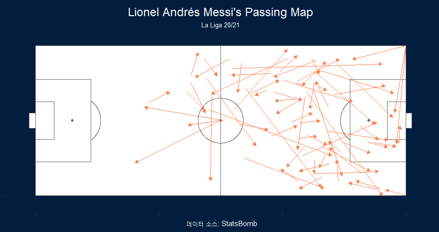 # 패스 맵 messi_pass <- clean_df %>% filter(player.name == 'Lionel Andrés Messi Cuccittini') %>% filter(type.name == 'Pass') ggplot(messi_pass) + annotate_pitch(dimensions = pitch_statsbomb) + geom_segment(aes(x=location.x, y=location.y, xend=pass.end_location.x, yend=pass.end_location.y), colour = "coral", arrow = arrow(length = unit(0.15, "cm"), type = "closed")) + labs(title="Lionel Andrés Messi's Passing Map", subtitle="La Liga 20/21", caption=" 데이터 소스: StatsBomb")+ theme( plot.background = element_rect(fill='#021e3f', color='#021e3f'), panel.background = element_rect(fill='#021e3f', color='#021e3f'), plot.title = element_text(hjust=0.5, vjust=0, size=14), plot.subtitle = element_text(hjust=0.5, vjust=0, size=8), plot.caption = element_text(hjust=0.5), text = element_text(family="Geneva", color='white'), panel.grid = element_blank(), axis.title = element_blank(), axis.text = element_blank() )