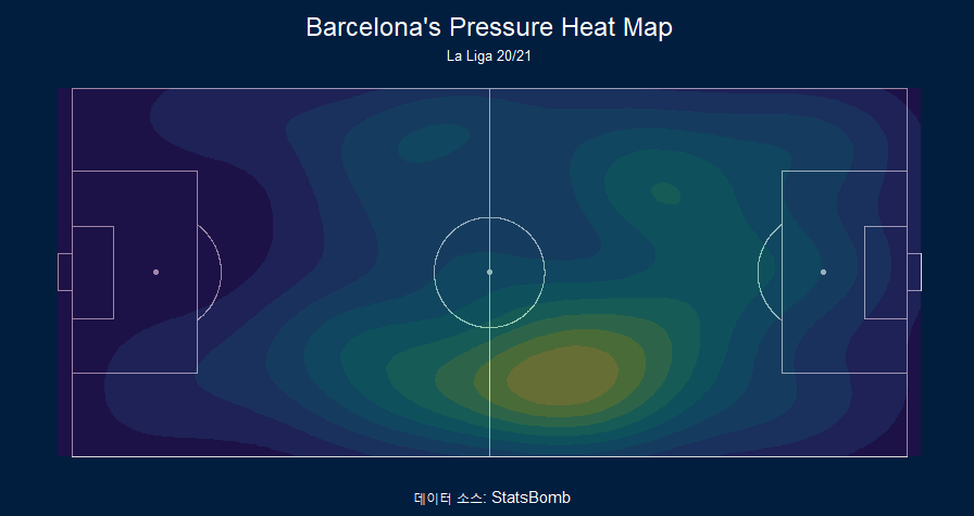 바르셀로나가 셀타비고를 압박하는 pressure map 그려보기# Pressure Heat Map barcelona_pressure <- clean_df %>% filter(team.name == 'Barcelona') %>% filter(type.name == 'Pressure') ggplot(barcelona_pressure)+ annotate_pitch(dimensions = pitch_statsbomb, fill='#021e3f', colour='#DDDDDD') + geom_density2d_filled(aes(location.x, location.y, fill=..level..), alpha=0.4, contour_var='ndensity') + scale_x_continuous(c(0, 120)) + scale_y_continuous(c(0, 80)) + labs(title="Barcelona's Pressure Heat Map", subtitle="La Liga 20/21", caption=" 데이터 소스: StatsBomb")+ theme_minimal() + theme( plot.background = element_rect(fill='#021e3f', color='#021e3f'), panel.background = element_rect(fill='#021e3f', color='#021e3f'), plot.title = element_text(hjust=0.5, vjust=0, size=14), plot.subtitle = element_text(hjust=0.5, vjust=0, size=8), plot.caption = element_text(hjust=0.5), text = element_text(family="Geneva", color='white'), panel.grid = element_blank(), axis.title = element_blank(), axis.text = element_blank(), legend.position = "none" )