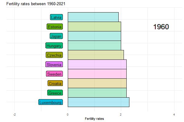 7. 연도별 출생율이 낮은 나라의 top 10 순위를 보자. (1960년대부터 2021년)