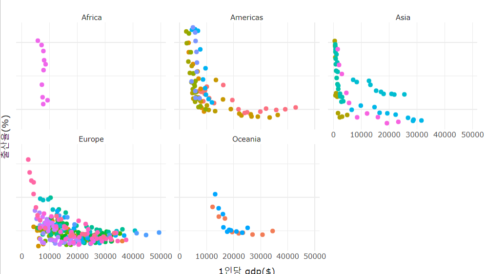 #패키지 library(tidyverse) library(stringr) library(gganimate) library(countrycode) library(gapminder) #데이터로드 gapminder <- gapminder %>% mutate(iso3c = countrycode(country, origin = 'country.name', destination = 'iso3c')) df <-read.csv("./data/나라별_국가별_출산율.csv") df %>% filter(LOCATION !="EU" | LOCATION !="OAVG") %>% mutate (name = countrycode(LOCATION, origin = 'iso3c', destination = 'country.name')) %>% select(name, TIME,Value) %>% mutate(Value = round(Value,2))-> df15. 1인당 gdp가 올라가면 출산율은 떨어지는가?