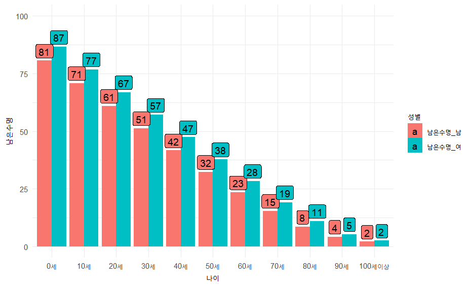 #5. 시각화 하기life_table %>% filter(PRD_DE == "2021") %>% select(5,9,10) %>% slice(seq(1, 101, by=10)) %>% rename(나이 = colnames(.)[1], 남은수명_남 = colnames(.)[2], 남은수명_여 = colnames(.)[3]) %>% mutate(나이 = fct_reorder(나이, -남은수명_남)) %>% pivot_longer(-1, names_to = "성별", values_to = "남은수명") %>% ggplot(aes(x=나이 , y=남은수명, fill=성별))+geom_col(position = "dodge")+ scale_y_continuous(limits = c(0, 100))+ geom_label(aes(label=round(남은수명)), vjust = -0.2, position = position_dodge(width = .9))+ theme_minimal()