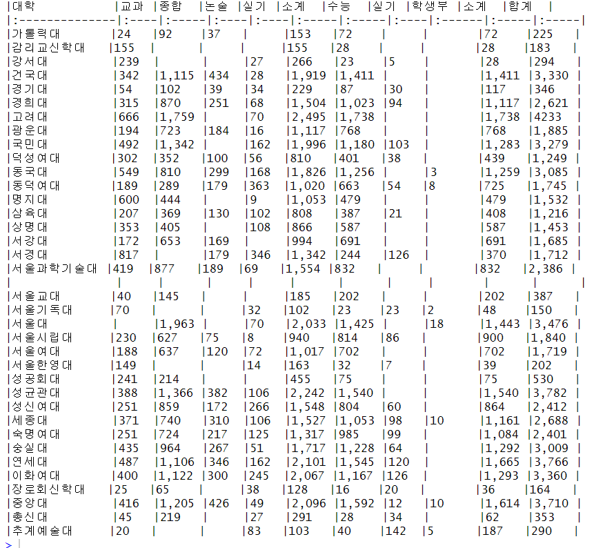 get_page_dims(pdf_file) region <- c(140, 0, 800, 612) mat <- extract_tables( file = pdf_file, pages = 16, guess = FALSE, area = list(region) )[[1]] df <- as.data.frame(mat) df %>%select(-1) -> df1 colnames(df1) <- c("대학", "교과", "종합", "논술", "실기", "소계", "수능", "실기", "학생부", "소계", "합계") df1 %>% kable()