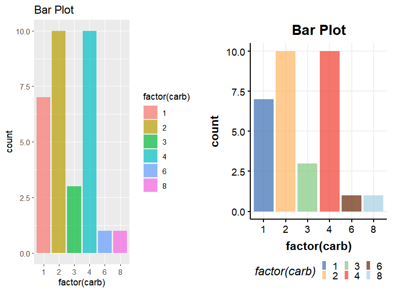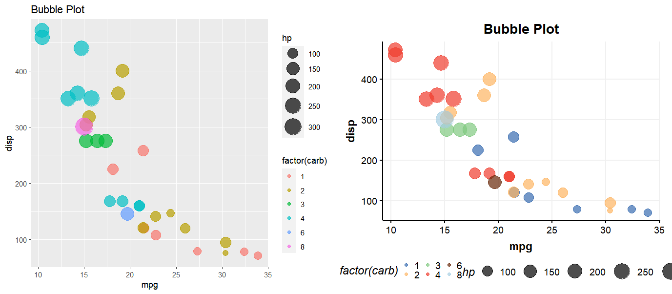 install.packages("remotes") remotes::install_github("HanjoStudy/quotidieR")Scatter <- ggplot(mtcars, aes(mpg,disp,color=factor(carb))) + geom_point(size=3) + labs(title="Scatter Plot") grid.arrange(Scatter,(Scatter +scale_colour_Publication()+ theme_Publication()),nrow=1)
