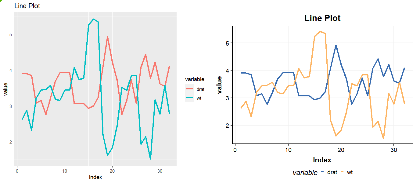 mtcars$Index <- 1:nrow(mtcars) dat <- melt(mtcars,id.vars = c("Index"),measure.vars = c("drat","wt")) Line <- ggplot(dat,aes(Index,value,colour=variable))+geom_line(size=1.3) + labs(title="Line Plot") grid.arrange(Line,(Line +scale_colour_Publication()+ theme_Publication()),nrow=1) P <- ggplot(data = mpg,aes(cty, hwy,color=class))+geom_point(size=3) + facet_wrap(~ manufacturer,scales="free")+ labs(title="Plot With Facets") P P +scale_colour_Publication()+ theme_Publication()